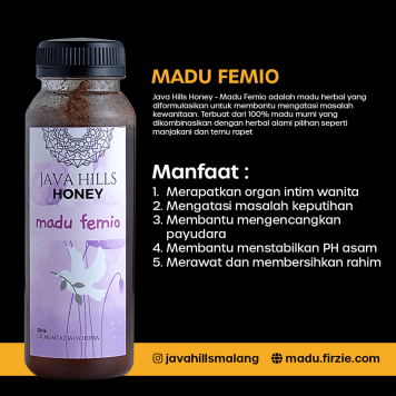 Java Hills Honey – Madu Femio adalah madu herbal yang diformulasikan untuk membantu mengatasi masalah kewanitaan. Terbuat dari 100% madu murni yang dikombinasikan dengan herbal alami pilihan seperti manjakani dan temu rapet