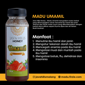 Java Hills Honey – Madu Umamil merupakan madu herbal yang diformulasikan untuk menutrisi ibu hamil dan janin. Terbuat dari 100% madu murni yang dikombinasikan dengan herbal alami pilihan seperti Kurma Ajwa dan All Varian Buah-buahan.